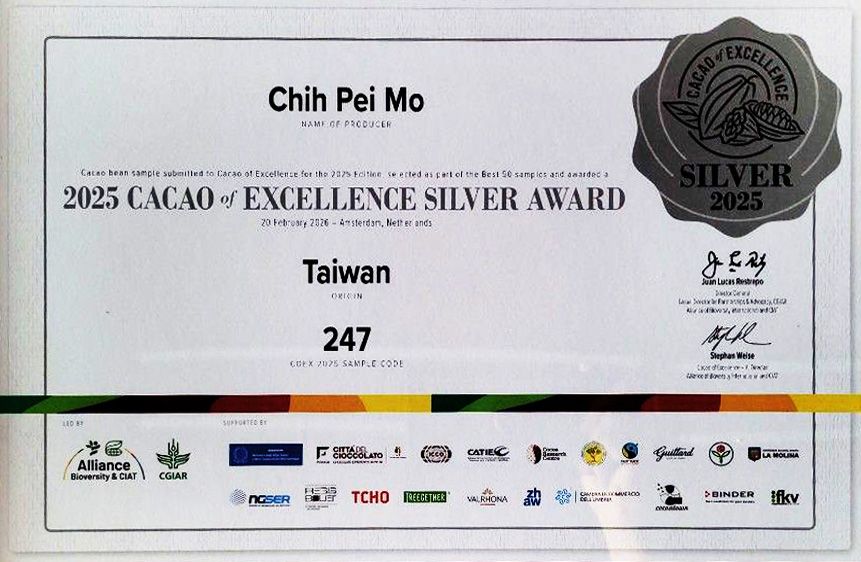 本會會員老莫可可以屏東在地栽培的優質可可豆,榮獲 「2025 CoEx 卓越可可豆競賽銀牌」,為台灣可可再添一筆亮眼的國際成績。